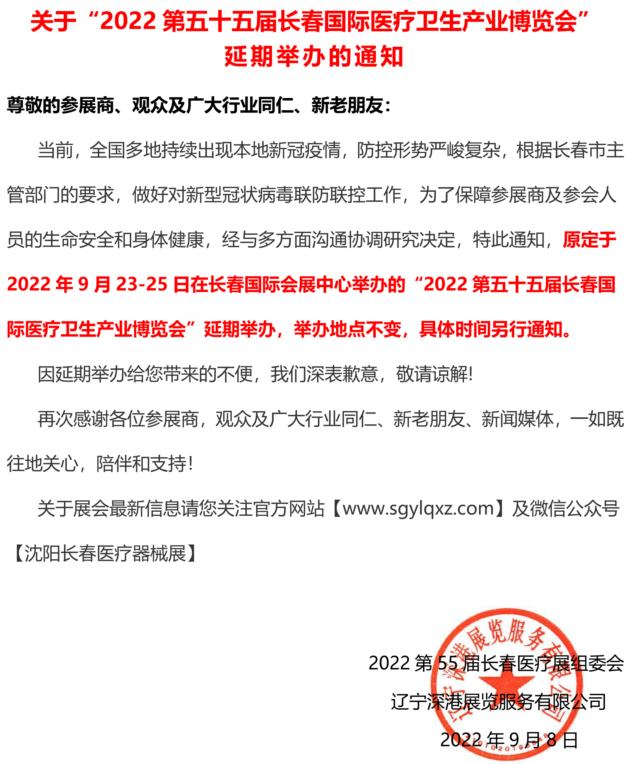 | 關(guān)于“2022第五十五屆長春國際醫(yī)療衛(wèi)生產(chǎn)業(yè)博覽會”延期舉辦的通知 | |