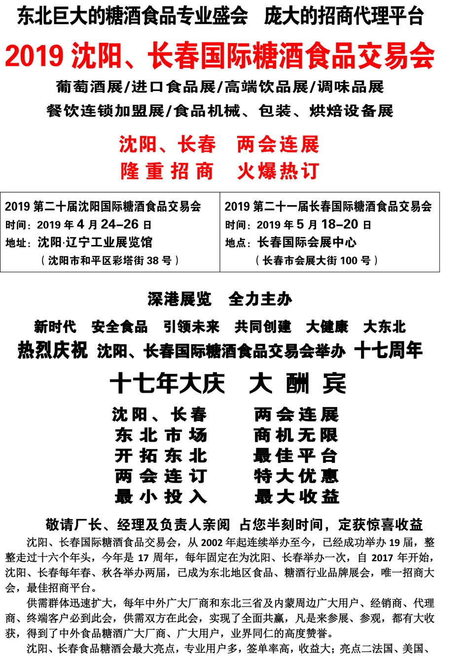 | 2019沈陽4月、長(zhǎng)春5月國際糖酒食品交易會(huì) 兩會(huì)連展 特大優(yōu)惠! | |