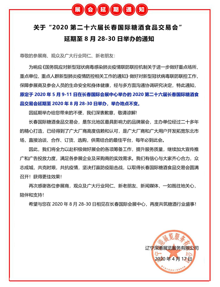 | 【重要通知】關(guān)于“2020第二十六屆長春國際糖酒食品交易會”延期至8月28-30日舉辦的通知 | |
