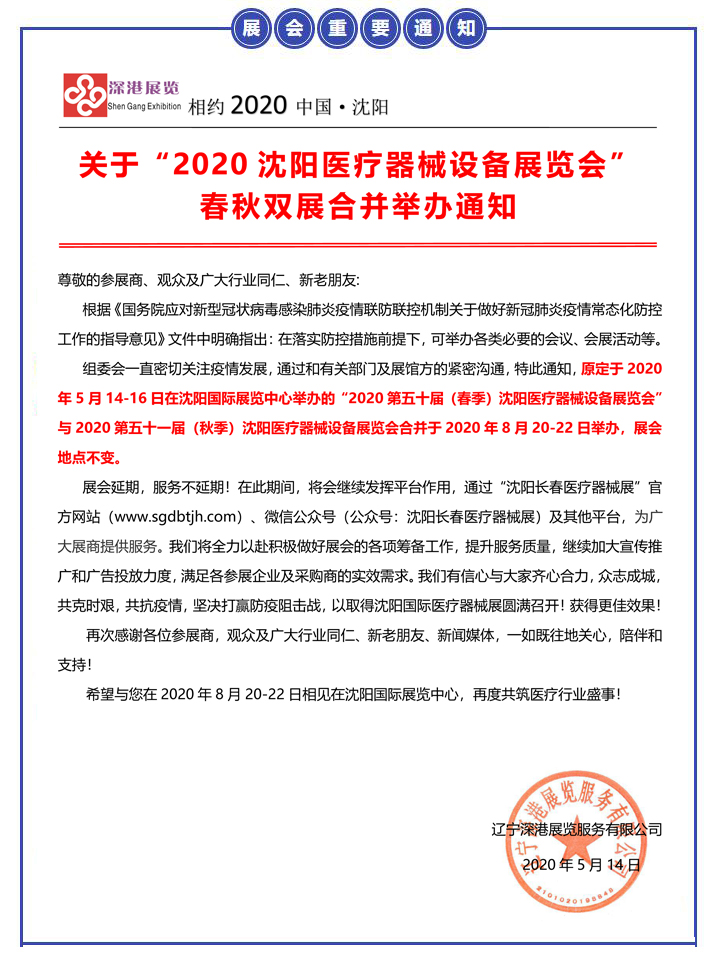 | 【雙展合并】2020第五十一屆沈陽(yáng)國(guó)際醫(yī)療器械設(shè)備展覽會(huì)8月20-22日在沈陽(yáng)國(guó)際展覽中心舉辦?。?! | |