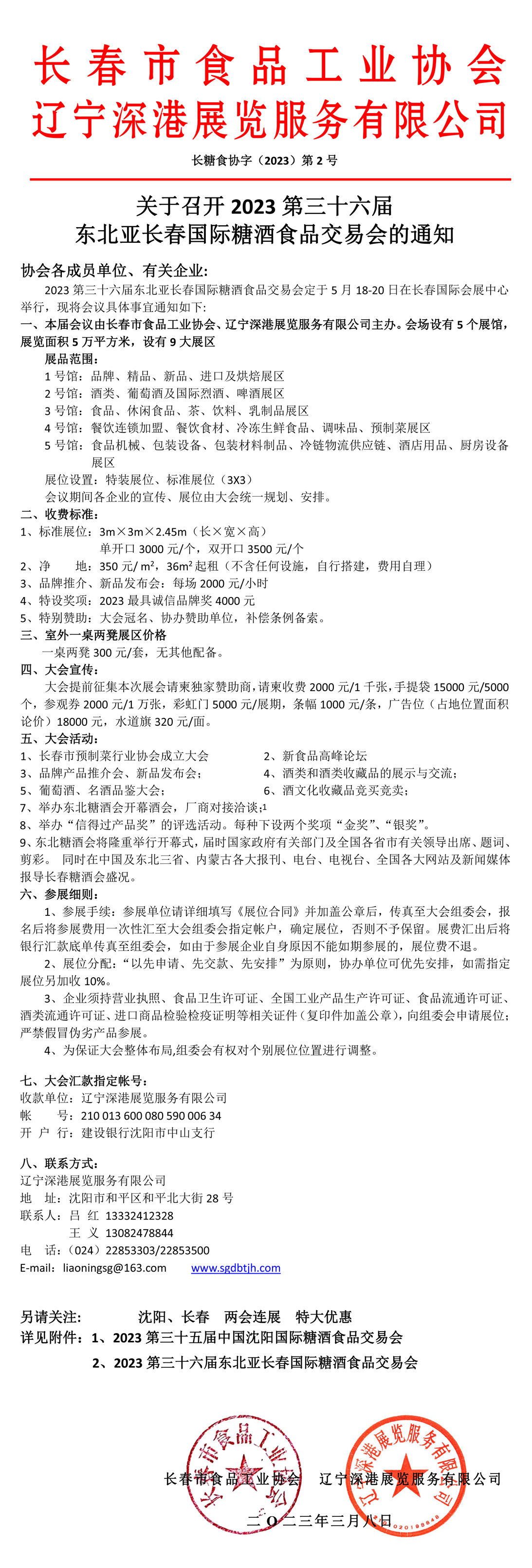 協(xié)會(huì)各成員單位、有關(guān)企業(yè): 2023第三十六屆東北亞長(zhǎng)春國(guó)際糖酒食品交易會(huì)定于5月18-20日在長(zhǎng)春國(guó)際會(huì)展中心舉行,現(xiàn)將會(huì)議具體事宜通知如下: 一、本屆會(huì)議由長(zhǎng)春市食品工業(yè)協(xié)會(huì)、遼寧深港展覽服務(wù)有限公司主辦。會(huì)場(chǎng)設(shè)有5個(gè)展館,展覽面積5萬(wàn)平方米,設(shè)有9大展區(qū) 展品范圍: 1號(hào)館:品牌、精品、新品、進(jìn)口及烘焙展區(qū) 2號(hào)館:酒類、葡萄酒及國(guó)際烈酒、啤酒展區(qū) 3號(hào)館:食品、休閑食品、茶、飲料、乳制品展區(qū) 4號(hào)館:餐飲連鎖加盟、餐飲食材、冷凍生鮮食品、調(diào)味品、預(yù)制菜展區(qū) 5號(hào)館:食品機(jī)械、包裝設(shè)備、包裝材料制品、冷鏈物流供應(yīng)鏈、酒店用品、廚房設(shè)備展區(qū) 展位設(shè)置:特裝展位、標(biāo)準(zhǔn)展位(3X3) 會(huì)議期間各企業(yè)的宣傳、展位由大會(huì)統(tǒng)一規(guī)劃、安排。 二、收費(fèi)標(biāo)準(zhǔn): 1、標(biāo)準(zhǔn)展位:3m×3m×2.45m(長(zhǎng)×寬×高) 單開口3000元/個(gè),雙開口3500元/個(gè) 2、凈 地:350元/ m2,36m2起租(不含任何設(shè)施,自行搭建,費(fèi)用自理) 3、品牌推介、新品發(fā)布會(huì):每場(chǎng)2000元/小時(shí) 4、特設(shè)獎(jiǎng)項(xiàng):2023最具誠(chéng)信品牌獎(jiǎng)4000元 5、特別贊助:大會(huì)冠名、協(xié)辦贊助單位,補(bǔ)償條例備索。 三、室外一桌兩凳展區(qū)價(jià)格 一桌兩凳300元/套,無(wú)其他配備。 四、大會(huì)宣傳: 大會(huì)提前征集本次展會(huì)請(qǐng)柬獨(dú)家贊助商,請(qǐng)柬收費(fèi)2000元/1千張,手提袋15000元/5000個(gè),參觀券2000元/1萬(wàn)張,彩虹門5000元/展期,條幅1000元/條,廣告位(占地位置面積論價(jià))18000元,水道旗320元/面。 五、大會(huì)活動(dòng): 1、長(zhǎng)春市預(yù)制菜行業(yè)協(xié)會(huì)成立大會(huì) 2、新食品高峰論壇 3、品牌產(chǎn)品推介會(huì)、新品發(fā)布會(huì); 4、酒類和酒類收藏品的展示與交流; 5、葡萄酒、名酒品鑒大會(huì); 6、酒文化收藏品競(jìng)買競(jìng)賣; 7、舉辦東北糖酒會(huì)開幕酒會(huì),廠商對(duì)接洽談; 8、舉辦“信得過產(chǎn)品獎(jiǎng)”的評(píng)選活動(dòng)。每種下設(shè)兩個(gè)獎(jiǎng)項(xiàng)“金獎(jiǎng)”、“銀獎(jiǎng)”。 9、東北糖酒會(huì)將隆重舉行開幕式,屆時(shí)國(guó)家政府有關(guān)部門及全國(guó)各省市有關(guān)領(lǐng)導(dǎo)出席、題詞、剪彩。 同時(shí)在中國(guó)及東北三省、內(nèi)蒙古各大報(bào)刊、電臺(tái)、電視臺(tái)、全國(guó)各大網(wǎng)站及新聞媒體報(bào)導(dǎo)長(zhǎng)春糖酒會(huì)盛況。 六、參展細(xì)則: 1、參展手續(xù):參展單位請(qǐng)?jiān)敿?xì)填寫《展位合同》并加蓋公章后,傳真至大會(huì)組委會(huì),報(bào)名后將參展費(fèi)用一次性匯至大會(huì)組委會(huì)指定帳戶,確定展位,否則不予保留。展費(fèi)匯出后將銀行匯款底單傳真至組委會(huì),如由于參展企業(yè)自身原因不能如期參展的,展位費(fèi)不退。 2、展位分配:“以先申請(qǐng)、先交款、先安排”為原則,協(xié)辦單位可優(yōu)先安排,如需指定展位另加收10%。 3、企業(yè)須持營(yíng)業(yè)執(zhí)照、食品衛(wèi)生許可證、全國(guó)工業(yè)產(chǎn)品生產(chǎn)許可證、食品流通許可證、酒類流通許可證、進(jìn)口商品檢驗(yàn)檢疫證明等相關(guān)證件(復(fù)印件加蓋公章),向組委會(huì)申請(qǐng)展位;嚴(yán)禁假冒偽劣產(chǎn)品參展。 4、為保證大會(huì)整體布局,組委會(huì)有權(quán)對(duì)個(gè)別展位位置進(jìn)行調(diào)整。